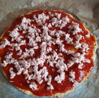 5. Sacar y poner tomate frito sin azúcar atún al natural queso bajo en grasa y rucula. Meter de nuevo en el horno 15 minutos a 200 grados.